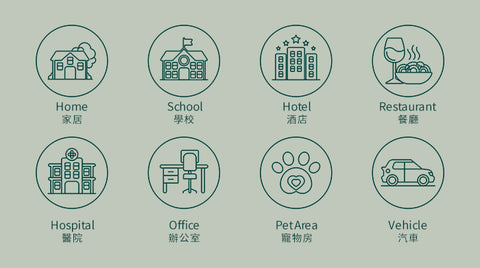 Metair can be used for the long-term, realtime, high-efficiency disinfection applications of the living environment, working environment, and closed public environment, e.g.: